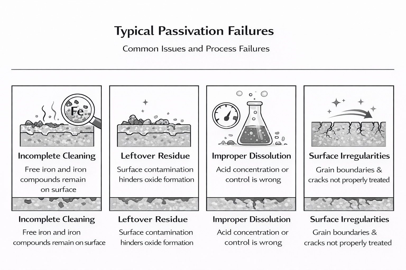 Addressing these failures requires careful control of each step, from preparation through final treatment, to ensure that a complete and durable passive layer is achieved.